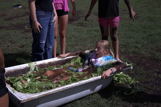 Youth competed in tribes (Gideon, Barak and Samson, named after 3 heroes of faith mentioned in Hebrews 11) to win the golden gnome. Tribe wars consisted of building, puzzling, gross challenges (yes, that is a bathtub full of creek water, lettuce and 3 year old BBQ sauce), swimming, throwing and of course capturing flags.